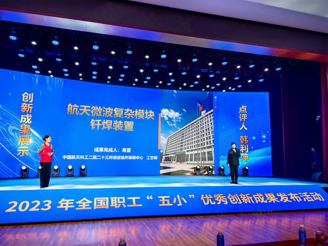 1月16日,由全国总工会劳动和经济工作部、中国工人出版社联合主办的2023年全国职工“五小”优秀创新成果发布活动在江苏徐州举行。全国总工会副主席、书记处书记马璐出席活动。此次发布活动揭晓了20项优秀创新成果,中国航天科工二院23所微波组件装调中心“航天微波复杂模块钎焊装置创新成果”获此荣誉,并作为5个最具代表性作品之一在成果发布活动上进行汇报交流,大国工匠二院二八三厂精密制造车间主任曹彦生受邀作为专家点评职工创新成果。