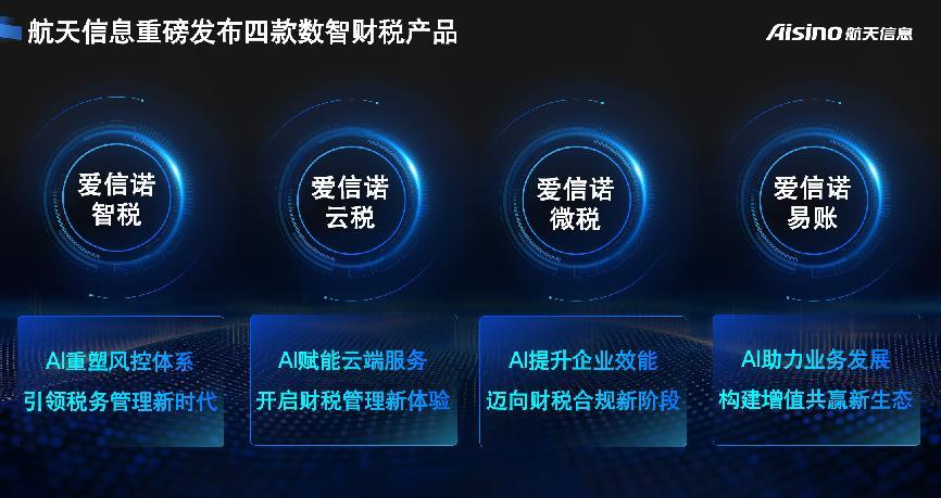 航天信息日前重磅发布AI财税智能产品矩阵,包括爱信诺智税、爱信诺云税、爱信诺微税、爱信诺易账四大产品,精准锚定集团型企业、大中型企业、小微企业及代账机构的差异化需求,覆盖各类企业财税管理全生命周期,构建起从基础记账到战略决策的完整智能财税生态,助力企业提升合规经营和风险防控水平,加快推进稳健发展,引领AI财税产业生态升级。