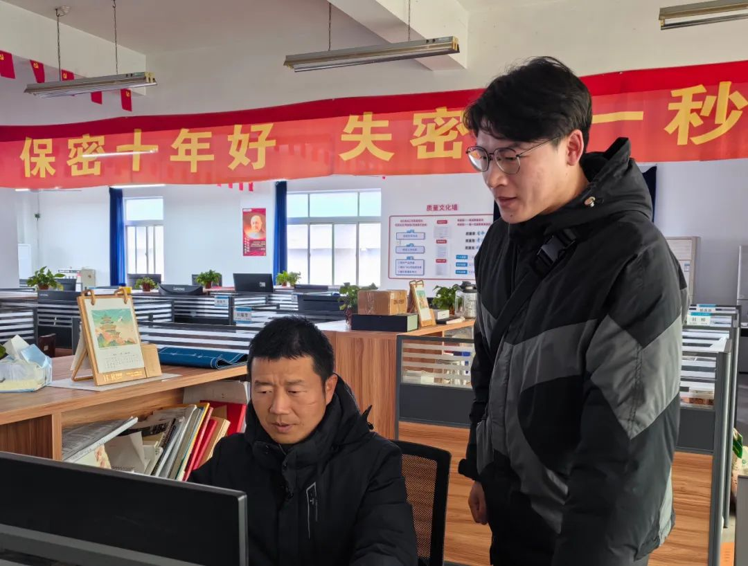 为确保各项科研生产任务高质量、高标准按时履约交付,春节期间,红林公司部分干部职工坚守岗位,他们严格按程序、按制度、按标准加工每一件产品,对待每一道工序,全力奋战开门红。图为装配检验班组职工正在仔细校对零件数据。(图文/尹旋坤)