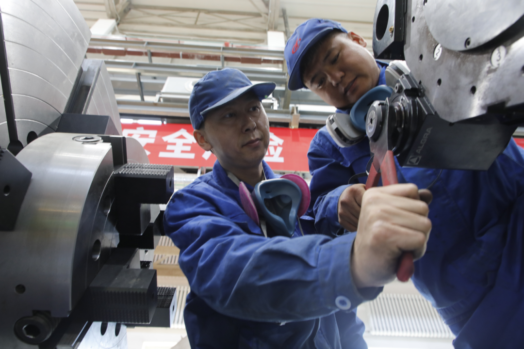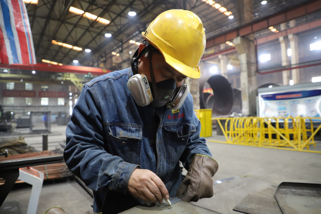 金岗重工新能源装备制造中心冷作工组职工严格按照操作流程与图纸尺寸,对钢板进行测量、划线与折弯,力求保质保量圆满交付生产任务。