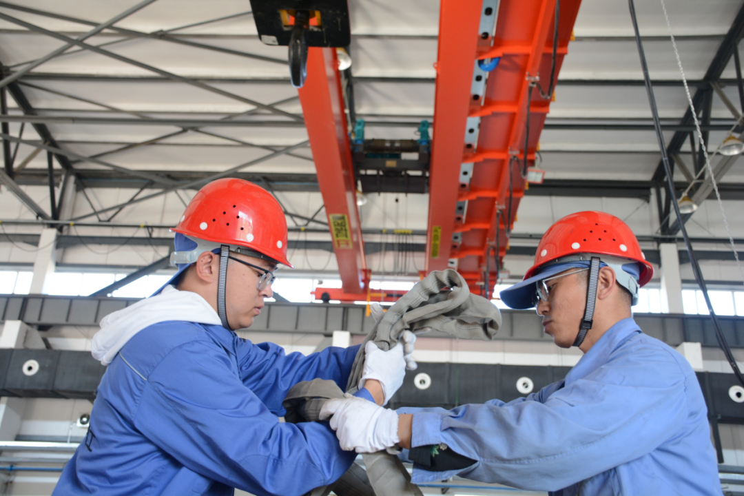 红峡公司某车间工房内,两名职工熟练地用吊绳对产品进行捆绑,粗粝的吊绳在两人手中灵活传递,几个回合下来,产品被稳稳地固定住,为下一道工序做好铺垫。