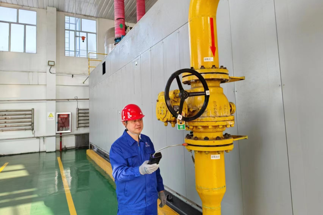 六院科保动力分公司水暖运行组职工正在检测厂区供暖系统燃气管道,确保供暖运行安全,保障六院科研生产不受气温骤降的影响。