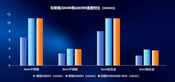 在工艺实测方面,对比常规3000W激光器,锐智系列3000/4000-IRW平均速度提升超40%,其中在6mm铝合金提升可达52%;对比常规4000W,锐智系列3000/4000-IRW与之薄板切割速度基本持平。