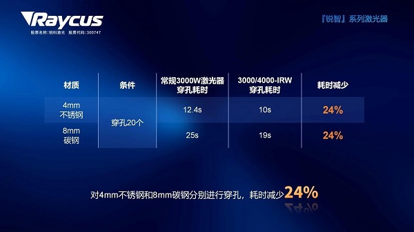 使用常规3000W激光器和锐智系列3000/4000-IRW激光器分别对4mm不锈钢和8mm碳钢进行穿孔,其中常规3000W激光器穿孔耗时分别为12.4s和25s,3000/4000-IRW激光器穿孔耗时分别为10s和19s,耗时均减少24%。