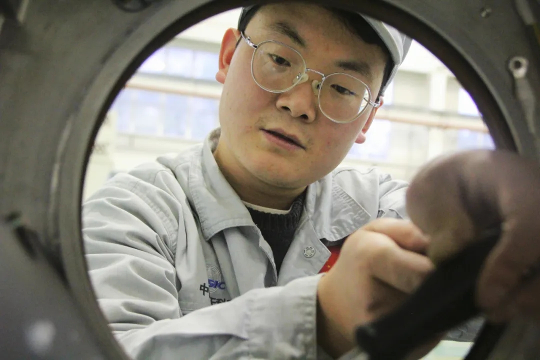 装配车间内,负责首件产品舱段装配工作的操作员杨振宇,正手持塞尺,对一部件的安装间隙进行装后自检。