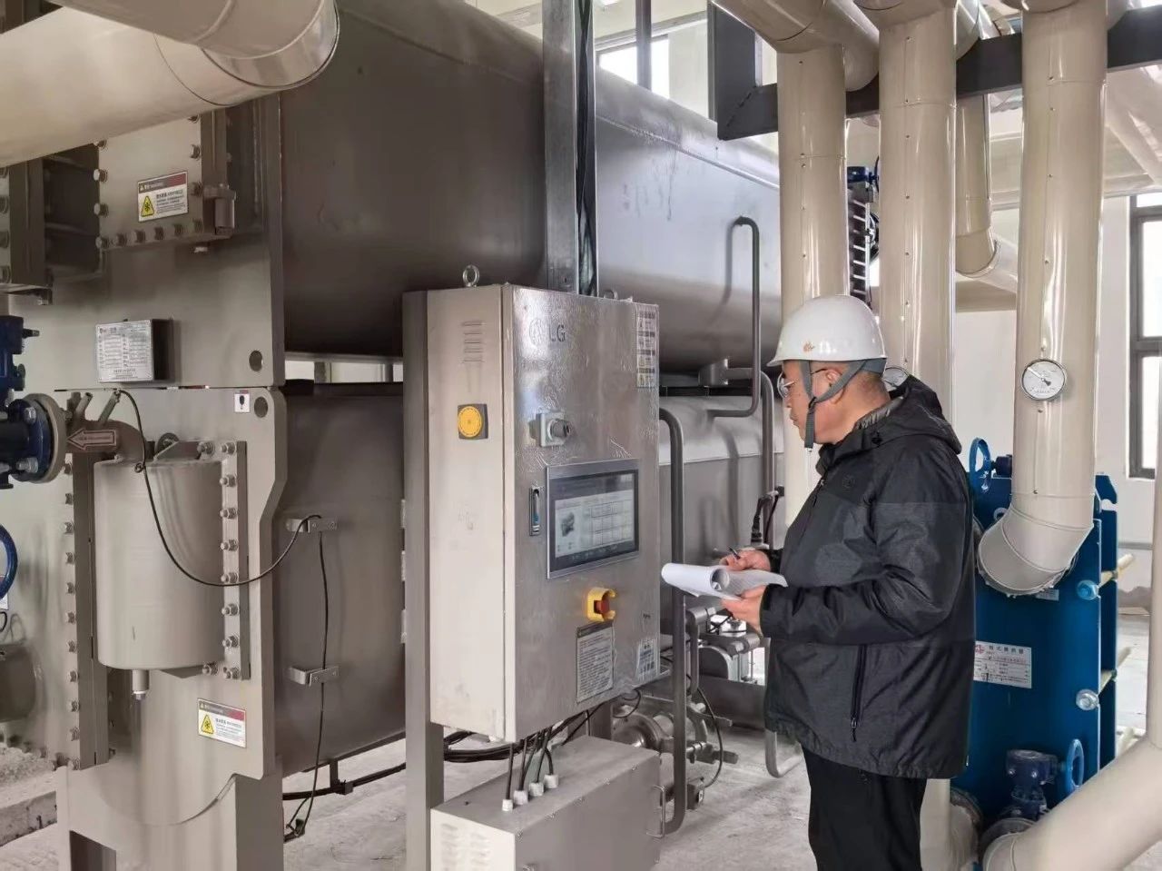 近日,正在试运行的换热机组发生停运故障,该机组承担着项目的供暖、空调、新风系统热源供给任务,目前处于调试阶段,由施工方负责运行。