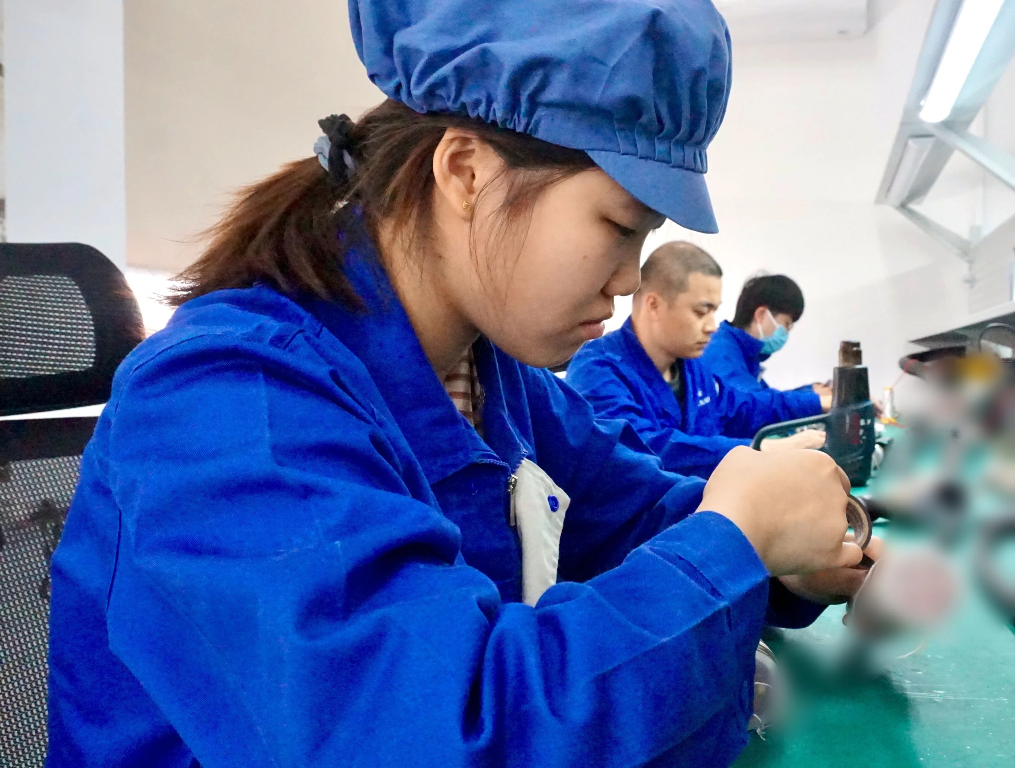 "师傅,我总觉得手有点僵。"她抬头对我说。我轻拍她肩膀:"熟练了就好了,按标准化作业流程操作,要把每个焊点都当作艺术品对待。"她深吸一口气,点点头,更专注地开始了焊接。