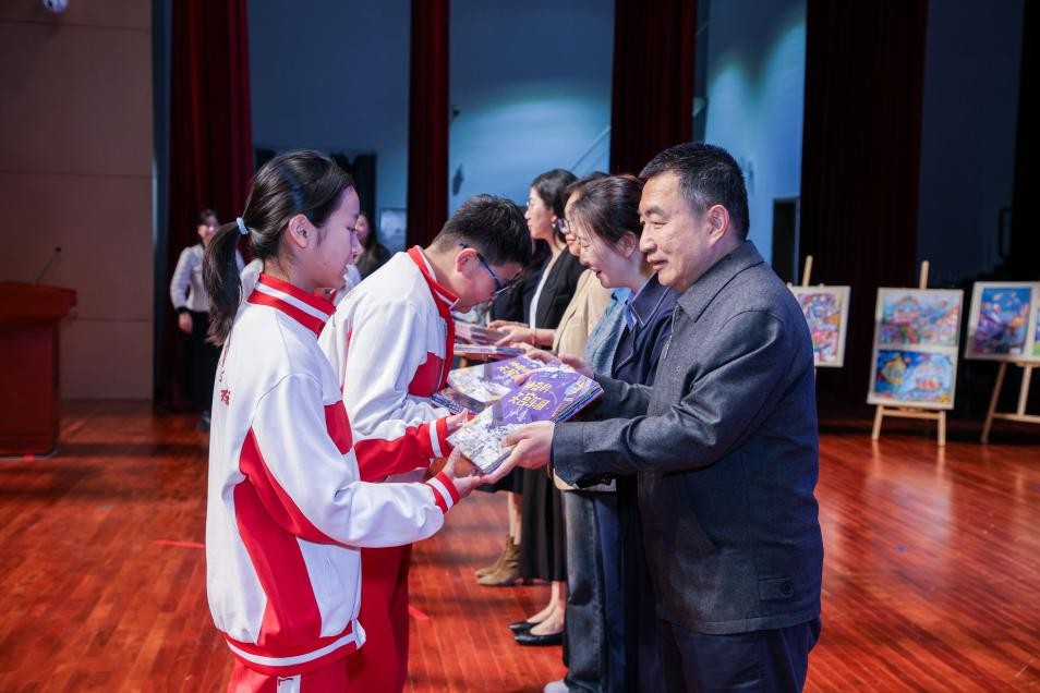 随后,吴杰、沈立凤与中国航天科工二院208所二级专务李晓红共同触摸启动球,主视觉大屏同步呈现绘本封面与“天宫建成了”主题字,标志着这套入选“十四五”国家重点出版物出版规划项目的科普绘本正式发布。紧接着的赠书仪式上,与会嘉宾将绘本赠予学生,为育英校园播撒下航天梦想的种子。