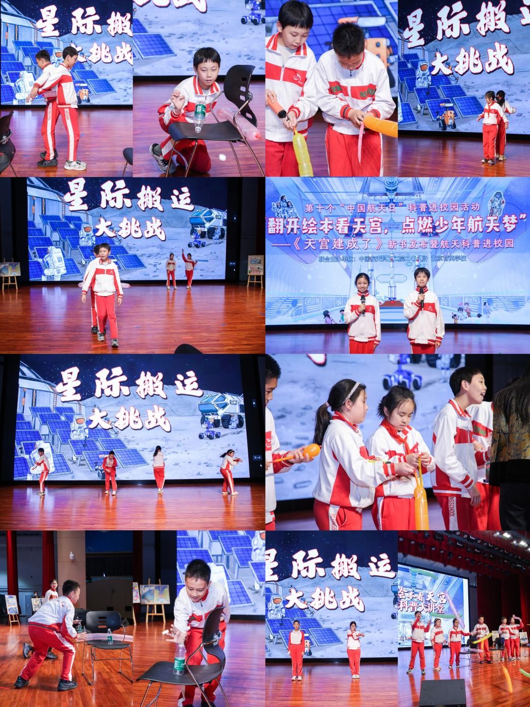 课堂末尾开展的“星际搬运大挑战”更是将活动推向高潮:学生通过“大象鼻子转”游戏模拟航天员转椅训练,并进行趣味盎然的星际物资搬运挑战;在火箭发射模拟赛中,大家通过放飞充气气球,直观理解作用力与反作用力原理。此外,报告厅内展示的育英学生科幻画作品,营造出浓厚的太空氛围;作者分享的“天宫画展”“少年拍天宫”,带领青少年亲临发射场见证火箭发射等创作故事,让航天知识更具人文温度。