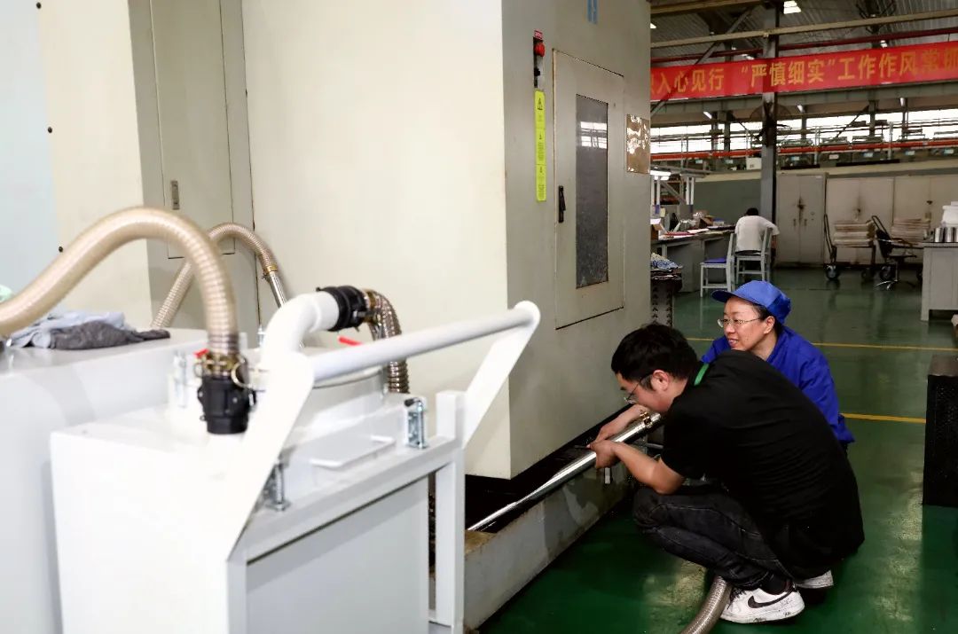 在大厅的另一侧,车工小杨正认真地跟设备厂家人员学习清洗机床切削液。数控机床作为生产的关键设备,其运行状态直接影响生产节奏。为确保其“健康”,该公司不惜投入重金,购置清洗机和净化机,有效解决了设备维护保养耗时耗力、清理不彻底的难题。