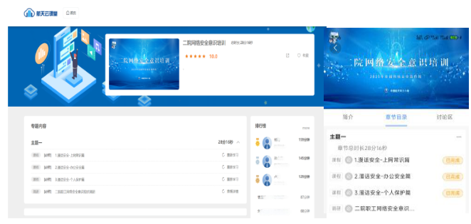 在航天云课堂开设线上网络安全意识培训和趣味竞赛,主要包括个人信息保护、办公安全、人工智能安全等网络安全知识。全院5700余人次积极参加在线培训和竞赛,130余名员工勇闯百关,通过寓教于乐普及网络安全知识。