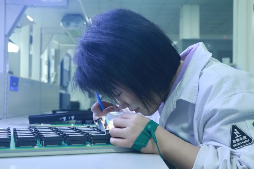 走进班组工作区,师傅们眼神专注而坚定,目光紧盯电路板,手臂平稳移动,烙铁在指尖灵活运转。在她们手中,烙铁仿佛画笔,在电路板上勾勒出一个个完美的焊点。
