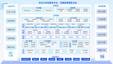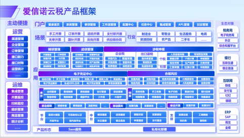 爱信诺云税秉持“让财税管理更简单、更智能、更有价值”,提出业务流程一体化、数据资产一体化、风险管控一体化、业财税融合一体化“四个一体化”理念。产品采用“三端一平台”架构,即SaaS云端、移动端、运营管理端、连接服务平台,覆盖销项管理、进项管理、电子凭证管理、费控报销、电子档案管理、全税申报、合规风控等核心模块,构建“开、收、用、管、报”全链路闭环。