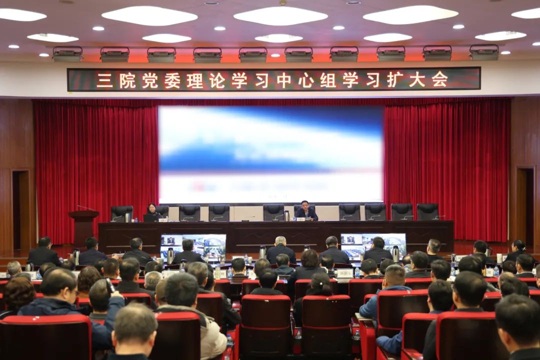 三院全体在家院领导、型号“两总”、本部各部门负责人,院属各单位党政主要领导,部分单位领导班子成员、本部相关部门负责人等共400余人在主会场和视频分会场参加了学习。三院党委书记施毅、副院长(主持工作)程进分别主持党委理论中心组学习扩大会、宣讲培训并讲话。