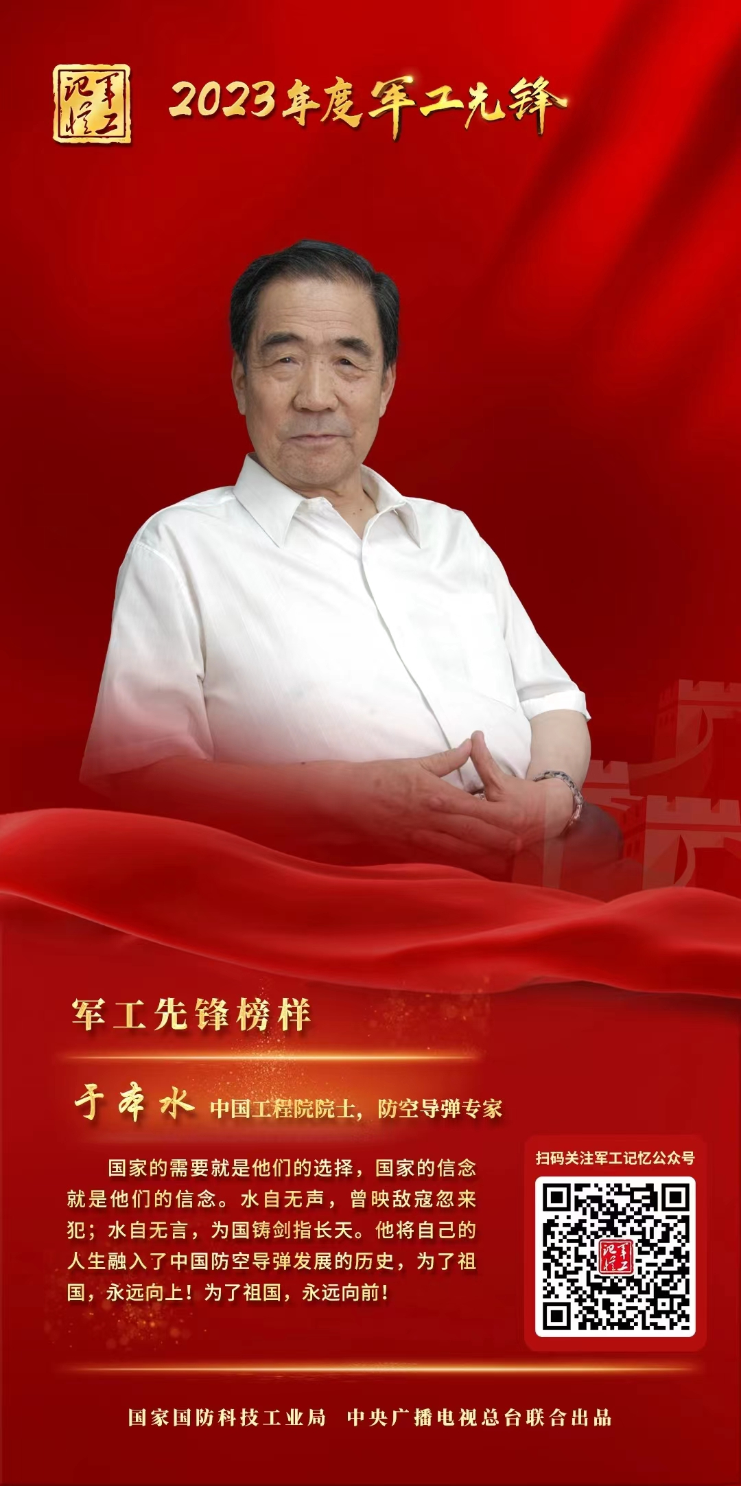 2023年12月28日晚,由中央广播电视总台军事节目中心和国家国防科技工业局新闻宣传中心联合打造的年度重点特别节目《军工先锋》在CCTV-7国防军事频道播出。我国著名防空导弹专家于本水院士当选2023年度“军工先锋榜样”。