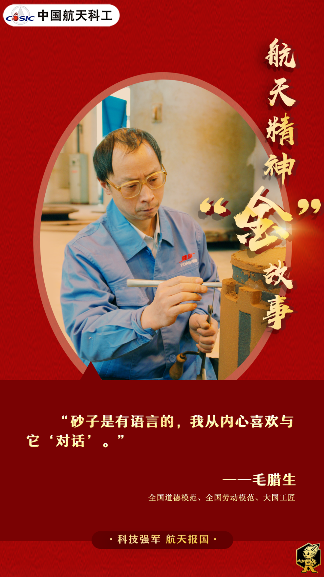 航天江南集团有限公司所属航天风华公司的铸造工人、全国道德模范毛腊生,秉持一颗匠心,坚守一份执着,40多年扎根一线与砂子“对话”,书写新时代航天技能工人的敬业奉献篇章。