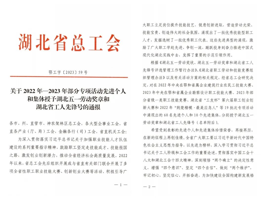 同时,从湖北省总工会《关于命名2023年荆楚工匠学院暨表扬省级优秀带徒名师、学习型职工的通报》(鄂工字[2023]57号文)获悉,公司职工吕品喜获2023年湖北省“优秀学习型职工”荣誉称号。