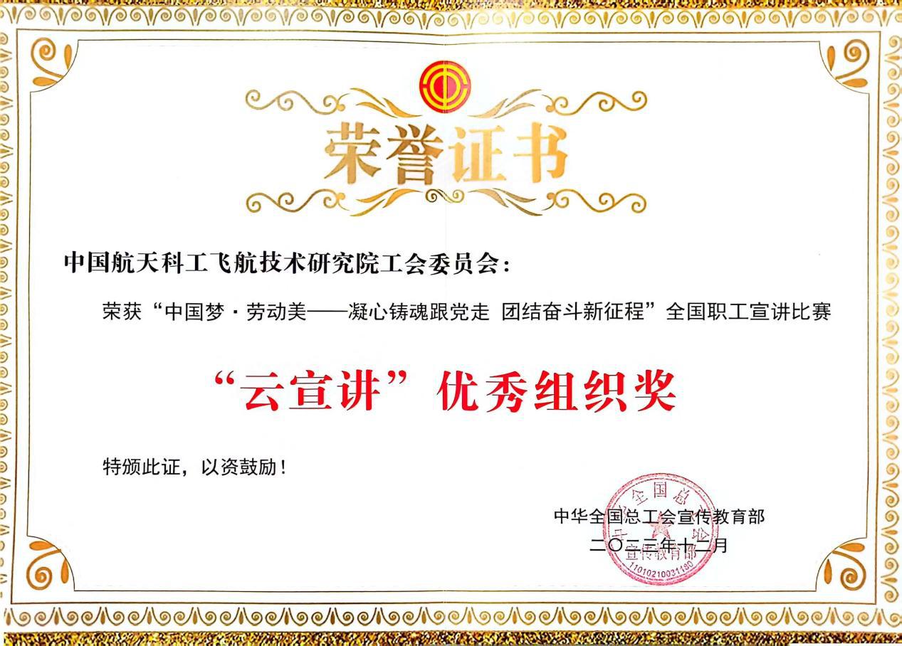 近日,全国总工会宣传教育部下发《关于“中国梦·劳动美——凝心铸魂跟党走 团结奋斗新征程”全国职工宣讲比赛“云宣讲”获奖情况的通报》,中国航天科工三院工会获得优秀组织单位,也是航天系统唯一获此殊荣的单位。此次评选,共有15家地市级工会及15家机关企事业单位获奖。