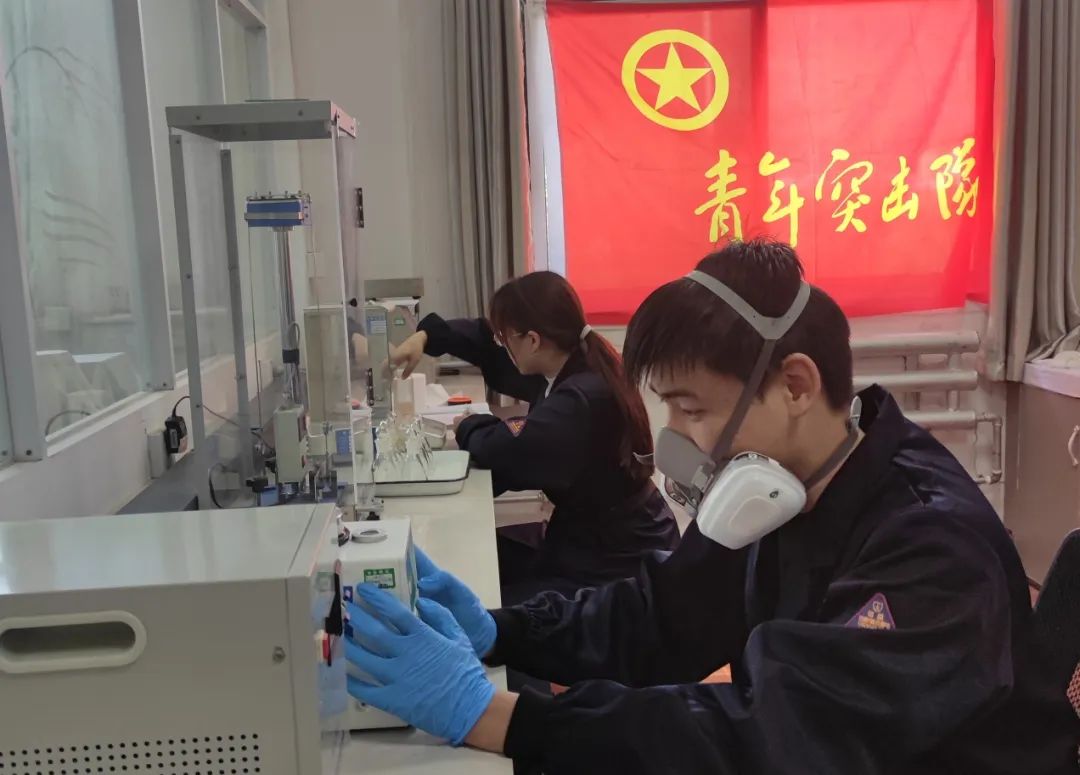 面对新目标、新要求,突击队员们敢于“亮剑”,始终冲锋在前。“小李,有急活,快把你的队员召集起来!”在102化学分析组,组长小胡对“飞跃”青年突击队队长小李说道。原来是装药分厂先后送来一批原材料,需要在规定时间内完成该批原料的水分、粘度、分子量等测试。突击队成员闻讯而动,“悦悦,这个数据有点异常,你帮我看一下。”“不是什么大问题,应该是参数设置有问题……”