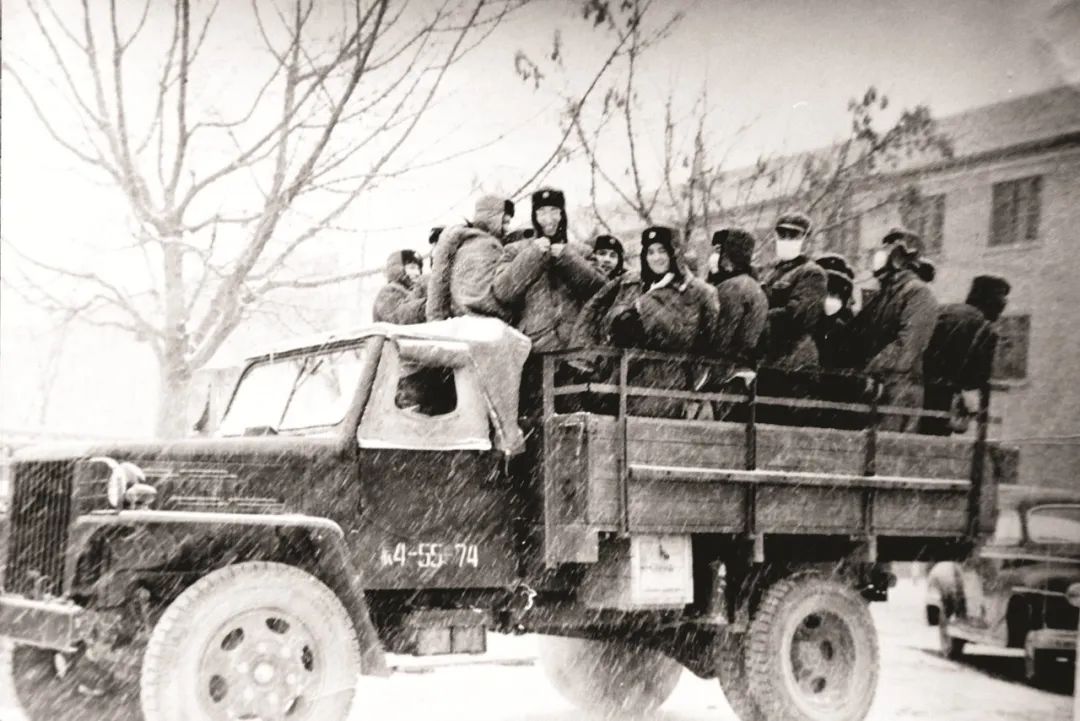 1959年张履谦前排(左一)等人在风雪时节奔赴红旗一号导弹雷达试验场的途中