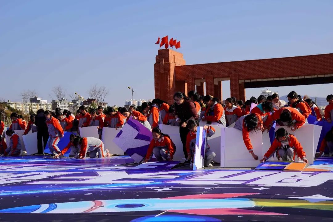 在知识寻宝环节,500多位女童参与航天知识竞赛,通过答题获得一块属于自己坐标的追梦大拼图,根据手中拼图的坐标在操场上找到相应位置,最后共同完成“航天筑梦未来 佑我春蕾圆梦”拼图。