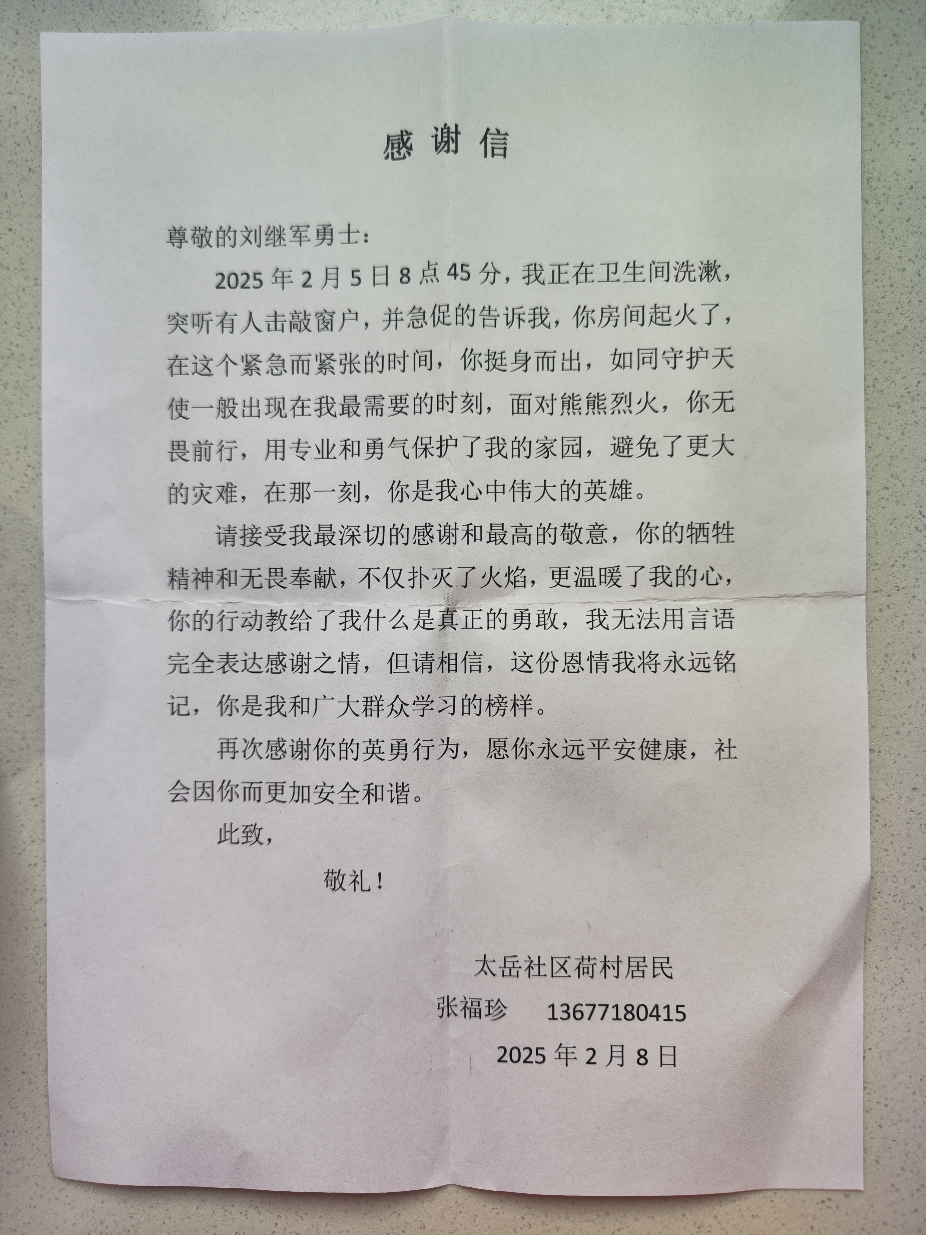 老人急忙走到门口时,正好碰见敲窗喊话的人——南湖公司装焊车间钳工组职工刘继军。他拉住眼前慌张的七旬独居老人,一面上下查看她有没有受伤,一面安慰道:“嬢嬢,你别急,你赶快报火警,我先进去看看。”