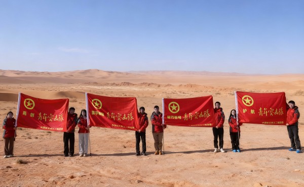 郭大勇在现场为4支青年突击队授旗。当青年突击队的旗帜飘扬在试验场,青年们感到使命感在胸膛滚烫。耳畔是整齐响亮的誓言,身边是并肩而立的伙伴,年轻的面庞充满坚毅。戈壁的夕阳为猎猎旌旗镀上金边,青年的誓言与旷野的风声交织共鸣。旗帜不仅承载着信任与期望,更点燃了青年冲锋的斗志。
